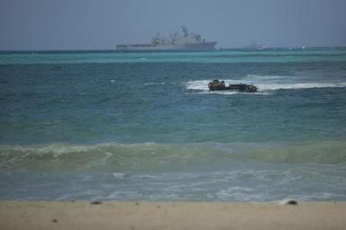 | Keywords: combatcamera hawaiimarines lance cpl. matthew casbarro lancecplmatthewcasbarro marinecorps pals15 bellows afb bellowsafb hawaii us landscape shore seaside outdoor beach ocean water coast sea An Amphibious Assualt Vehicle with the 15th Marine Expeditionary Unit heads to shore during an amphibious demonstration at Bellows Air Force Base, Hawaii, May 19, 2015. Senior military leaders of allies and partners visited Hawaii to participate in the U.S. Pacific Command Amphibious Leaders Symposium. (U.S. Marine Corps photo by Lance Cpl. Matthew Casbarro/Not Reviewed) An Amphibious Assualt Vehicle with the 15th Marine Expeditionary Unit heads to shore during an amphibious demonstration at Bellows Air Force Base, Hawaii, May 19, 2015. Senior military leaders of allies and partners visited Hawaii to participate in the U.S. Pacific Command Amphibious Leaders Symposium. (U.S. Marine Corps photo by Lance Cpl. Matthew Casbarro/Not Reviewed) |
