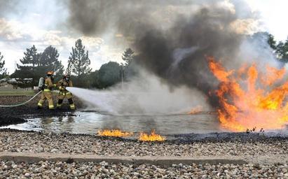 MAKE A MEME View Large Image Fire protection specialists with the 182nd Civil Engineer Squadron, Illinois Air National Guard, demonstrate how they extinguish jet fuel fires during a controlled burn at Wingman and Family Day at the 182nd Airlift Wing, Peoria, Ill., ...