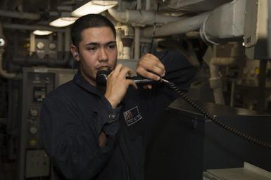 | Keywords: carneytorota u.s. navy usnavy arleigh burke-class arleighburkeclass destroyer uss carney usscarney ddg ddg 64 ddg64 rota spain europe president's european phased adaptive approach presidentseuropeanphasedadaptiveapproach mass communication specialist masscommunicationspecialist 3rd class 3rdclass mc mc3 jonathan b. trejo jonathanbtrejo engineering drills training people indoor 150919-N-XG464-023 ATLANTIC OCEAN (Sept. 19, 2015) Gas Turbine Systems Technician (Mechanical) 3rd Class Andy Rodriguez, from Tampa, Florida, relays information to Central Control Station during an engineering drill aboard USS Carney (DDG 64) Sept. 19, 2015. Carney, an Arleigh Burke-class guided-missile destroyer, is conducting naval operations in the U.S. 6th Fleet area of operations in support of U.S. national security interests in Europe. (U.S. Navy photo by Mass Communication Specialist 3rd Class Jonathan B. Trejo/Released) 150919-N-XG464-023 ATLANTIC OCEAN (Sept. 19, 2015) Gas Turbine Systems Technician (Mechanical) 3rd Class Andy Rodriguez, from Tampa, Florida, relays information to Central Control Station during an engineering drill aboard USS Carney (DDG 64) Sept. 19, 2015. Carney, an Arleigh Burke-class guided-missile destroyer, is conducting naval operations in the U.S. 6th Fleet area of operations in support of U.S. national security interests in Europe. (U.S. Navy photo by Mass Communication Specialist 3rd Class Jonathan B. Trejo/Released) |