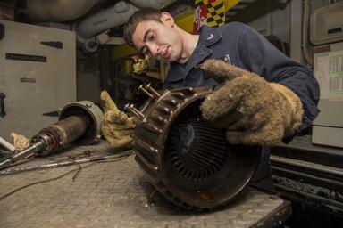| Keywords: uss kearsarge (lhd 3); arciaga; 26th marine expeditionary unit; usskearsargelhd3arciaga26thmarineexpeditionaryunit mediteranian sea mediteraniansea usa uss kearsarge (lhd 3); arciaga; 26th marine expeditionary unit; lhd 3; underway; engineering usskearsargelhd3arciaga26thmarineexpeditionaryunitlhd3underwayengineering indoor 151020-N-KW492-071 MEDITERRANEAN SEA (Oct. 20, 2015) Electrician's Mate 3rd Class Vincent Larocca, a motor rewind technician, from Dumont , New Jersey, checks on an engine part aboard the amphibious assault ship USS Kearsarge (LHD 3) Oct. 20, 2015. Kearsarge, deployed as part of the Kearsarge Amphibious Ready Group, is conducting naval operations in the U.S. 6th Fleet area of operations in support of U.S. national security interests in Europe. (U.S. Navy Photo by Mass Communication Specialist Seaman Apprentice Ryre Arciaga/Released) 151020-N-KW492-071 MEDITERRANEAN SEA (Oct. 20, 2015) Electrician's Mate 3rd Class Vincent Larocca, a motor rewind technician, from Dumont , New Jersey, checks on an engine part aboard the amphibious assault ship USS Kearsarge (LHD 3) Oct. 20, 2015. Kearsarge, deployed as part of the Kearsarge Amphibious Ready Group, is conducting naval operations in the U.S. 6th Fleet area of operations in support of U.S. national security interests in Europe. (U.S. Navy Photo by Mass Communication Specialist Seaman Apprentice Ryre Arciaga/Released) |