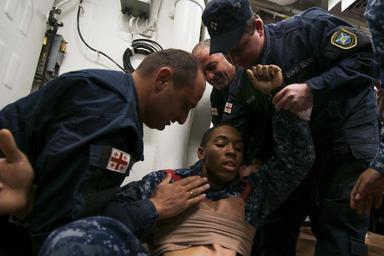 | Keywords: superior alt 151021-N-AX546-079 BLACK SEA (Oct. 21, 2015) Quartermaster 3rd Class Cole Murphy, from Queens, New York, simulates being a victim of a sucking chest wound while members of the Georgian Coast Guard treat his injury aboard USS Porter (DDG 78) during a bilateral training exercise Oct. 21, 2015. Porter, an Arleigh Burke-class guided-missile destroyer, forward-deployed to Rota, Spain, is on a routine patrol conducting naval operations in the U.S. 6th Fleet area of operations in support of U.S. national security interests in Europe. (U.S. Navy photo by Mass Communication Specialist 1st Class Sean Spratt/Released) 151021-N-AX546-079 BLACK SEA (Oct. 21, 2015) Quartermaster 3rd Class Cole Murphy, from Queens, New York, simulates being a victim of a sucking chest wound while members of the Georgian Coast Guard treat his injury aboard USS Porter (DDG 78) during a bilateral training exercise Oct. 21, 2015. Porter, an Arleigh Burke-class guided-missile destroyer, forward-deployed to Rota, Spain, is on a routine patrol conducting naval operations in the U.S. 6th Fleet area of operations in support of U.S. national security interests in Europe. (U.S. Navy photo by Mass Communication Specialist 1st Class Sean Spratt/Released) |