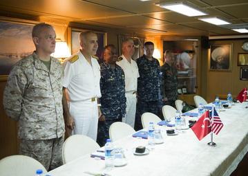 | Keywords: uss kearsarge (lhd 3); npase; purifoy; lhd 3; underway;turkish n usskearsargelhd3npasepurifoylhd3underwayturkishn foca turkey uss kearsarge (lhd 3); npase; purifoy; lhd 3; underway;turkish navy;egemen-15 usskearsargelhd3npasepurifoylhd3underwayturkishnavyegemen15 indoor 151024-N-YL073-168 FOCA, Turkey (Oct. 24, 2015) Military members of the Turkish navy, U.S. Navy and U.S. Marine Corps and Republic of Korea marines attend a press conference aboard the Turkish frigate TCG Kemalreis (F 247) at Foca Naval base during Egemen 2015, Oct. 24. Egemen is a Turkish-led and hosted amphibious exercise designed to increase tactical proficiencies and interoperability among participants. (U.S. Navy photo by Mass Communication Specialist 2nd Class Shamira Purifoy/Released) 151024-N-YL073-168 FOCA, Turkey (Oct. 24, 2015) Military members of the Turkish navy, U.S. Navy and U.S. Marine Corps and Republic of Korea marines attend a press conference aboard the Turkish frigate TCG Kemalreis (F 247) at Foca Naval base during Egemen 2015, Oct. 24. Egemen is a Turkish-led and hosted amphibious exercise designed to increase tactical proficiencies and interoperability among participants. (U.S. Navy photo by Mass Communication Specialist 2nd Class Shamira Purifoy/Released) |