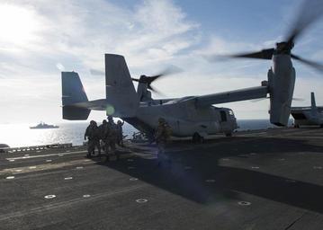 | Keywords: uss kearsarge (lhd 3); npase; preston; 26th marine expeditionary usskearsargelhd3npasepreston26thmarineexpeditionary aegean sea aegeansea usa uss kearsarge (lhd 3); npase; preston; 26th marine expeditionary unit; lhd 3; underway; egemen; turkish marines; marines; turkey; osprey usskearsargelhd3npasepreston26thmarineexpeditionaryunitlhd3underwayegementurkishmarinesmarinesturkeyosprey outdoor 151027-N-AX638-048 AEGEAN SEA (Oct. 27, 2015) Turkish Marines board an MV-22 Osprey on the flight deck of the amphibious assault ship USS Kearsarge (LHD 3) while participating in Exercise Egemen 2015, Oct. 27. Egemen is a Turkish-led and hosted amphibious exercise designed to increase tactical proficiencies and interoperability among participants. Kearsarge, deployed as part of the Kearsarge Amphibious Ready Group, is conducting naval operations in the U.S. 6th Fleet area of operations in support of U.S. national security interests in Europe. (U.S. Navy Photo by Mass Communication Specialist Seaman Tyler Preston/Released) 151027-N-AX638-048 AEGEAN SEA (Oct. 27, 2015) Turkish Marines board an MV-22 Osprey on the flight deck of the amphibious assault ship USS Kearsarge (LHD 3) while participating in Exercise Egemen 2015, Oct. 27. Egemen is a Turkish-led and hosted amphibious exercise designed to increase tactical proficiencies and interoperability among participants. Kearsarge, deployed as part of the Kearsarge Amphibious Ready Group, is conducting naval operations in the U.S. 6th Fleet area of operations in support of U.S. national security interests in Europe. (U.S. Navy Photo by Mass Communication Specialist Seaman Tyler Preston/Released) |