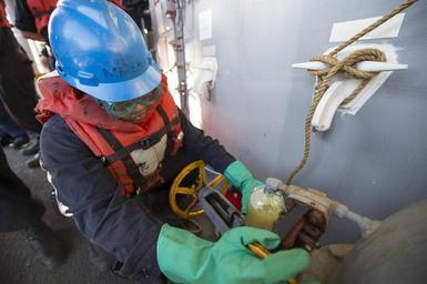 | Keywords: uss oak hill ussoakhill lsd 51 lsd51 amphibious dock landing ship amphibiousdocklandingship mediterranean sea mediterraneansea 151030-N-JO245-364 MEDITERRANEAN SEA (Oct. 30, 2015) Engineman 3rd Class Levar Cooper, from Brooklyn, New York, takes a sample of diesel fuel marine from a fueling station aboard the amphibious dock landing ship USS Oak Hill (LSD 51) during a replenishment-at-sea with the Military Sealift Command fleet replenishment oiler USNS Leroy Grumman (T-AO 195) Oct. 30, 2015. Oak Hill, deployed as part of the Kearsarge Amphibious Ready Group, is conducting naval operations in the U.S. 6th Fleet area of operations in support of U.S. national security interests in Europe. (U.S. Navy photo by Mass Communication Specialist 2nd Class Justin Yarborough/Released) 151030-N-JO245-364 MEDITERRANEAN SEA (Oct. 30, 2015) Engineman 3rd Class Levar Cooper, from Brooklyn, New York, takes a sample of diesel fuel marine from a fueling station aboard the amphibious dock landing ship USS Oak Hill (LSD 51) during a replenishment-at-sea with the Military Sealift Command fleet replenishment oiler USNS Leroy Grumman (T-AO 195) Oct. 30, 2015. Oak Hill, deployed as part of the Kearsarge Amphibious Ready Group, is conducting naval operations in the U.S. 6th Fleet area of operations in support of U.S. national security interests in Europe. (U.S. Navy photo by Mass Communication Specialist 2nd Class Justin Yarborough/Released) |