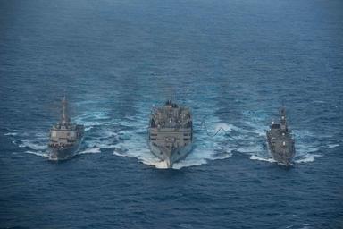 | Keywords: uss john c. stennis ussjohncstennis cvn 74 cvn74 uss stockdale ussstockdale philippine sea philippinesea outdoor 160222-N-BR087-358 PHILIPPINE SEA (Feb. 22, 2016) - Japanese Maritime Self-Defense Force Murasame-class destroyer JDS Samidare (DD-106) and the guided-missile destroyer USS Stockdale (DDG 106) receive an advanced biofuel mixture from the fast combat support ship USNS Rainier (T-AOE 7) during a replenishment at sea. Providing a ready force supporting security and stability in the Indo-Asia-Pacific, the John C. Stennis Strike Group is operating as part of the Great Green Fleet on a regularly scheduled 7th Fleet deployment. (U.S. Navy photo by Mass Communication Specialist Seaman Cole C. Pielop/Released) 160222-N-BR087-358 PHILIPPINE SEA (Feb. 22, 2016) - Japanese Maritime Self-Defense Force Murasame-class destroyer JDS Samidare (DD-106) and the guided-missile destroyer USS Stockdale (DDG 106) receive an advanced biofuel mixture from the fast combat support ship USNS Rainier (T-AOE 7) during a replenishment at sea. Providing a ready force supporting security and stability in the Indo-Asia-Pacific, the John C. Stennis Strike Group is operating as part of the Great Green Fleet on a regularly scheduled 7th Fleet deployment. (U.S. Navy photo by Mass Communication Specialist Seaman Cole C. Pielop/Released) |