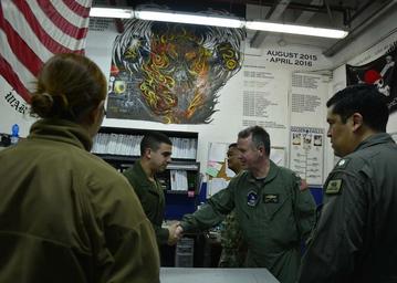| Keywords: second ctf 67 ctf67 160303-N-MV308-005 SIGONELLA, Sicily (March 3, 2016) Rear Adm. Matt Zirkle, commander, Submarines - NATO, meets with Sailors assigned to Patrol Squadron (VP) 9 during a visit to Naval Air Station Sigonella on March 3, 2016. Zirkle flew on VP-9’s P-3C Orion maritime patrol aircraft during NATO’s anti-submarine warfare exercise Dynamic Manta 2016 (DYMA 16). DYMA 16 involved ships, submarines, aircraft and personnel from eight Allied nations converging on the central Mediterranean Sea for anti-submarine warfare and anti-surface warfare training. (U.S. Navy photo by Mass Communication Specialist 3rd Class Amber L. Porter/Released) 160303-N-MV308-005 SIGONELLA, Sicily (March 3, 2016) Rear Adm. Matt Zirkle, commander, Submarines - NATO, meets with Sailors assigned to Patrol Squadron (VP) 9 during a visit to Naval Air Station Sigonella on March 3, 2016. Zirkle flew on VP-9’s P-3C Orion maritime patrol aircraft during NATO’s anti-submarine warfare exercise Dynamic Manta 2016 (DYMA 16). DYMA 16 involved ships, submarines, aircraft and personnel from eight Allied nations converging on the central Mediterranean Sea for anti-submarine warfare and anti-surface warfare training. (U.S. Navy photo by Mass Communication Specialist 3rd Class Amber L. Porter/Released) |