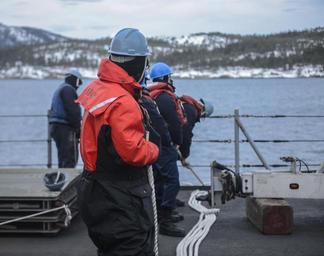 | Keywords: outdoor 160303-N-ZZ999-025 NORTH SEA (March 3, 2016) Sailors aboard the Whidbey Island-class dock landing ship USS Fort McHenry (LSD 43) maintain thier grip on a line in order to stabilize a patrol boat while loading it back on boad during Exercise Cold Response 2016 (CDR 16). CDR 16 involves maritime, land and air operation training and focuses on naval and amphibious operations transitioning to ground maneuver. The location in central Norway provides an extreme cold-weather environment for the 12 participating countries to collectively develop tactics, techniques and procedures and increase interoperability. (U.S. Navy photo by Mass Communication Specialist Seaman Apprentice Daniel C. Coxwest/ Released) 160303-N-ZZ999-025 NORTH SEA (March 3, 2016) Sailors aboard the Whidbey Island-class dock landing ship USS Fort McHenry (LSD 43) maintain thier grip on a line in order to stabilize a patrol boat while loading it back on boad during Exercise Cold Response 2016 (CDR 16). CDR 16 involves maritime, land and air operation training and focuses on naval and amphibious operations transitioning to ground maneuver. The location in central Norway provides an extreme cold-weather environment for the 12 participating countries to collectively develop tactics, techniques and procedures and increase interoperability. (U.S. Navy photo by Mass Communication Specialist Seaman Apprentice Daniel C. Coxwest/ Released) |