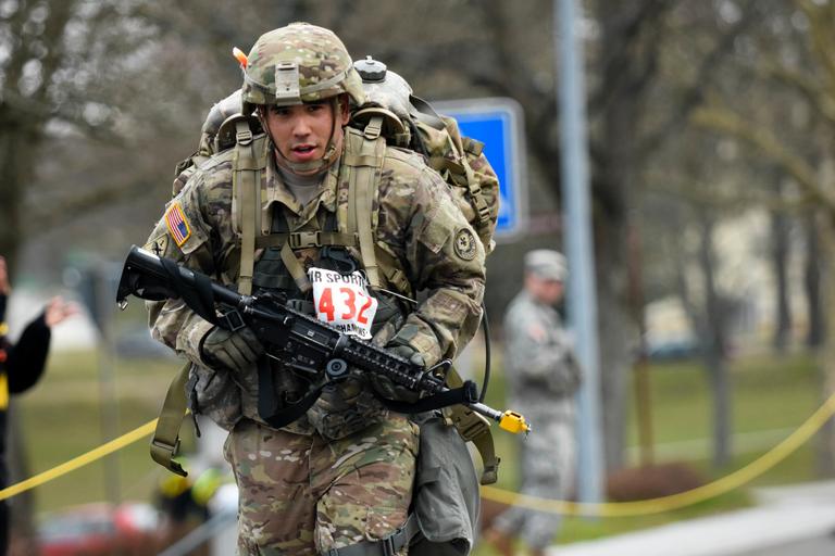 | Keywords: expert field medical badge expertfieldmedicalbadge competition 173rd airborne brigade combat team 173rdairbornebrigadecombatteam 12 miles 12miles ruck march ruckmarch us army europe usarmyeurope nato baumholder germany 2nd cavalry regiment 2ndcavalryregiment lager aulenbach lageraulenbach outdoor people U.S. Army Staff Sgt. Francisco Torres, with the 2nd Calvary Regiment, races toward the finish line to complete the 12-mile ruck march in under three hours, the last requirement to earn the U.S. Army Europe Expert Field Medical Badge at Lager Aulenbach in Baumholder, Germany, March 24, 2016. The U.S. Army Expert Field Medical Badge is awarded to Soldiers in medical professions who pass a variety of tests designed to measure proficiency in medical procedures, tactical skills and physical fitness. (U.S. Army photo by Capt. Jeku Arce) U.S. Army Staff Sgt. Francisco Torres, with the 2nd Calvary Regiment, races toward the finish line to complete the 12-mile ruck march in under three hours, the last requirement to earn the U.S. Army Europe Expert Field Medical Badge at Lager Aulenbach in Baumholder, Germany, March 24, 2016. The U.S. Army Expert Field Medical Badge is awarded to Soldiers in medical professions who pass a variety of tests designed to measure proficiency in medical procedures, tactical skills and physical fitness. (U.S. Army photo by Capt. Jeku Arce) |