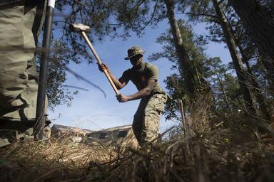 | Keywords: 24th marine expeditionary unit 24thmarineexpeditionaryunit 24th meu 24thmeu 2d mardiv 2dmardiv 2d marine aircraft wing 2dmarineaircraftwing 2d marine division 2dmarinedivision 2d maw 2dmaw 6th marine regiment 6thmarineregiment ah-1 cobra ah1cobra amphibious assault ship amphibiousassaultship amphibious transport dock amphibioustransportdock av-8b harrier jump jet av8bharrierjumpjet bataan amphibious ready group bataanamphibiousreadygroup battalion landing team 3rd battalion battalionlandingteam3rdbattalion camp lejeune camplejeune ce centcom clb 24 clb24 cljnc combat logistics battalion 24 combatlogisticsbattalion24 command element commandelement dock landing ship docklandingship eucom ground combat element groundcombatelement ii marine expeditionary force iimarineexpeditionaryforce ii mef iimef logistics combat element logisticscombatelement marine corps air station cherry point marinecorpsairstationcherrypoint marine corps air station new river marinecorpsairstationnewriver marine medium tiltrotor squadron 365 (reinforced) marinemediumtiltrotorsquadron365reinforced mcas cherry point mcascherrypoint mcas new river mcasnewriver mv-22 osprey mv22osprey north carolina northcarolina u.s. 5th fleet area of responsibility us5thfleetareaofresponsibility u.s. 6th fleet area of responsibility us6thfleetareaofresponsibility u.s. central command uscentralcommand u.s. european command useuropeancommand uh-1y huey uh1yhuey united states marine corps unitedstatesmarinecorps usmc uss bataan (lhd-5) ussbataanlhd5 uss carter hall (lsd-50) usscarterhalllsd50 uss mesa verde (lpd-19) ussmesaverdelpd19 vmm-365 (rein) vmm365rein united states unitedstates us outdoor U.S. Marine Corps Cpl. Alexander Desir, an administrative specialist with the 24th Marine Expeditionary Unit (MEU), hammers a tent stake into the ground during the set up of the MEU's communications exercise (COMMEX) at Camp Lejeune, N.C., March 29, 2016. The COMMEX was designed to refresh the skills of communications Marines and to ensure the equipment is fully functional. (U.S. Marine Corps photo by Cpl. Todd F. Michalek) U.S. Marine Corps Cpl. Alexander Desir, an administrative specialist with the 24th Marine Expeditionary Unit (MEU), hammers a tent stake into the ground during the set up of the MEU's communications exercise (COMMEX) at Camp Lejeune, N.C., March 29, 2016. The COMMEX was designed to refresh the skills of communications Marines and to ensure the equipment is fully functional. (U.S. Marine Corps photo by Cpl. Todd F. Michalek) |