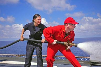| Keywords: flag ship flagship lcc-19 lcc19 u.s. navy usnavy uss blue ridge ussblueridge underway afff flying squad flyingsquad japan outdoor 160425-N-TV402-086 SOUTH CHINA SEA (April 25, 2016) - Damage Controlman Fireman Samantha Thomas, left, attached to the U.S. 7th Fleet flagship USS Blue Ridge (LCC 19) and Chief Damage Controlman Erik Prager, right, attached to Commander, Task Force 76 Detachment Sasebo, conduct training with an aqueous film forming foam hose. Blue Ridge is currently on patrol in the 7th Fleet area of operations strengthening and fostering relationships within the Indo-Asia-Pacific. (U.S. Navy photo by Mass Communication Specialist Seaman Timothy Hale/RELEASED) 160425-N-TV402-086 SOUTH CHINA SEA (April 25, 2016) - Damage Controlman Fireman Samantha Thomas, left, attached to the U.S. 7th Fleet flagship USS Blue Ridge (LCC 19) and Chief Damage Controlman Erik Prager, right, attached to Commander, Task Force 76 Detachment Sasebo, conduct training with an aqueous film forming foam hose. Blue Ridge is currently on patrol in the 7th Fleet area of operations strengthening and fostering relationships within the Indo-Asia-Pacific. (U.S. Navy photo by Mass Communication Specialist Seaman Timothy Hale/RELEASED) |