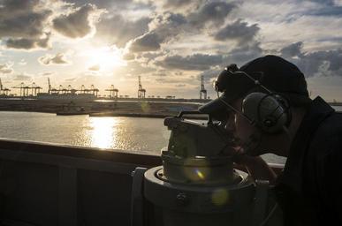| Keywords: uss porter (ddg 78) ussporterddg78 destroyer port side portside port said portsaid suez canal suezcanal alidade operations specialist operationsspecialist 160508-N-FQ994-016 PORT SAID (May 8, 2016) Operations Specialist Seaman Joshua Kusser, from Summersworth, New Hampshire, uses an alidade aboard USS Porter (DDG 78) as the ship transits Port Said to enter the Suez Canal en route to the Red Sea May 8, 2016. Porter, an Arleigh Burke-class guided-missile destroyer, forward-deployed to Rota, Spain, is conducting a routine patrol in the U.S. 6th Fleet area of operations in support of U.S. national security interests in Europe. (U.S. Navy Photo by Mass Communication Specialist 3rd Class Robert S. Price/Released) 160508-N-FQ994-016 PORT SAID (May 8, 2016) Operations Specialist Seaman Joshua Kusser, from Summersworth, New Hampshire, uses an alidade aboard USS Porter (DDG 78) as the ship transits Port Said to enter the Suez Canal en route to the Red Sea May 8, 2016. Porter, an Arleigh Burke-class guided-missile destroyer, forward-deployed to Rota, Spain, is conducting a routine patrol in the U.S. 6th Fleet area of operations in support of U.S. national security interests in Europe. (U.S. Navy Photo by Mass Communication Specialist 3rd Class Robert S. Price/Released) |