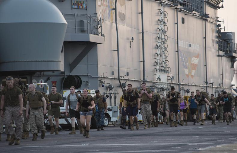 | Keywords: 160528-N-KR961-028 160528-N-KR961-028.jpg en 160528-N-KR961-028 GULF OF ADEN May 28 2016 Sailors and Marines aboard amphibious assault ship USS Boxer LHD 4 participate in a Memorial Day sunrise ruck march on the flight deck Boxer is the flagship for the Boxer Amphibious Ready Group and with the embarked 13th Marine Expeditionary Unit is deployed in support of maritime security operations and theater security cooperation efforts in the U S 5th Fleet area of operations U S Navy photo by Mass Communication Specialist 2nd Class Debra Daco/Released Unit Navy Media Content Services DVIDS Tags Ruck March; USS Boxer LHD 4 ; Amphibious Ready Group; U S Navy; 13th MEU; 13th Marine Expeditionary Unit; NMCS; CPR-1; DVIDS Bulk Import; BOXARG13MEU16; Memorial Observance 2016-05-28 Petty Officer 2nd Class Debra Daco https //www dvidshub net/image/2626345/160528-n-kr961-028 160528-N-KR961-028 2016-06-01 00 02 GULF OF ADEN PD-USGov-Military-Navy 13th Marine Expeditionary Unit USS Boxer LHD-4 Images from DoD uploaded by Fæ |