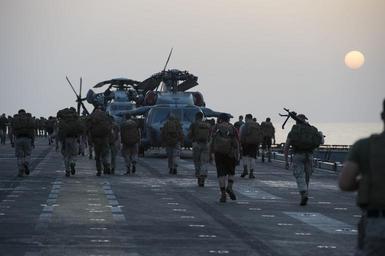 | Keywords: 160528-N-KR961-036 160528-N-KR961-036.jpg en 160528-N-KR961-036 GULF OF ADEN May 28 2016 Sailors and Marines aboard amphibious assault ship USS Boxer LHD 4 participate in a Memorial Day sunrise ruck march on the flight deck Boxer is the flagship for the Boxer Amphibious Ready Group and with the embarked 13th Marine Expeditionary Unit is deployed in support of maritime security operations and theater security cooperation efforts in the U S 5th Fleet area of operations U S Navy photo by Mass Communication Specialist 2nd Class Debra Daco/Released Unit Navy Media Content Services DVIDS Tags Ruck March; USS Boxer LHD 4 ; Amphibious Ready Group; U S Navy; 13th MEU; 13th Marine Expeditionary Unit; NMCS; CPR-1; DVIDS Bulk Import; BOXARG13MEU16; Memorial Observance 2016-05-28 Petty Officer 2nd Class Debra Daco https //www dvidshub net/image/2627548/160528-n-kr961-036 160528-N-KR961-036 2016-06-01 00 29 GULF OF ADEN PD-USGov-Military-Navy 13th Marine Expeditionary Unit USS Boxer LHD-4 Images from DoD uploaded by Fæ |