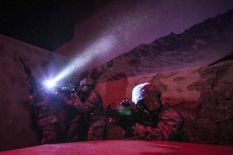 Keywords: usaf u.s. air force usairforce air national guard airnationalguard new jersey newjersey 177th security forces squadron 177thsecurityforcessquadron m4 training joint base mcguire-dix-lakehurst jointbasemcguiredixlakehurst jt2dc n.j. nj usa public domain publicdomain free U.S. Air Force Airmen from the New Jersey Air National Guard's 177th Security Forces Squadron maneuver through an indoor Military Operations in Urban Terrain (MOUT) site during training at the New Jersey National Guard's Joint Training & Training Development Center (JT2DC), Joint Base McGuire-Dix-Lakehurst, N.J., June 16, 2016. The 177th Security Forces Squadron was utilizing the ability for the JT2DC's training areas to simulate low-light conditions in an urban environment. The red and blue lighting simulates a moonlit night as seen through night vision devices. (U.S. Air National Guard photo by Tech. Sgt. Matt Hecht/Released) U.S. Air Force Airmen from the New Jersey Air National Guard's 177th Security Forces Squadron maneuver through an indoor Military Operations in Urban Terrain (MOUT) site during training at the New Jersey National Guard's Joint Training & Training Development Center (JT2DC), Joint Base McGuire-Dix-Lakehurst, N.J., June 16, 2016. The 177th Security Forces Squadron was utilizing the ability for the JT2DC's training areas to simulate low-light conditions in an urban environment. The red and blue lighting simulates a moonlit night as seen through night vision devices. (U.S. Air National Guard photo by Tech. Sgt. Matt Hecht/Released)