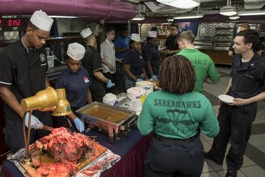 | Keywords: 160626-N-VQ947-056 160626-N-VQ947-056.jpg en 160626-N-VQ947-056 PHILIPPINE SEA June 26 2016 Bluejacket and 3 2 Associations members serve roast beef ice cream and cake on the aft mess decks of the U S Navy s only forward-deployed aircraft carrier USS Ronald Reagan CVN 76 The two volunteer organizations collaborated during a mess decks take-over event to show appreciation to the culinary specialists who work in the ship s galleys every day The mess decks take-over involved association members volunteering to work in the positions culinary specialists typically fill serving food The USS Ronald Reagan Carrier Strike Group is on patrol in the U S 7th Fleet area of responsibility supporting security and stability in the Indo-Asia-Pacific region U S Navy photo by Mass Communication Specialist 3rd Class Devin Kates/Released Unit Navy Media Content Services DVIDS Tags NMCS; DVIDS Bulk Import 2016-06-26 Petty Officer 3rd Class Devin Kates https //www dvidshub net/image/2693306/160626-n-vq947-056 160626-N-VQ947-056 2016-06-28 00 14 USS RONALD REAGAN CVN 76 PHILIPPINE SEA PD-USGov-Military-Navy USS Ronald Reagan CVN-76 Images from DoD uploaded by FĂŚ |