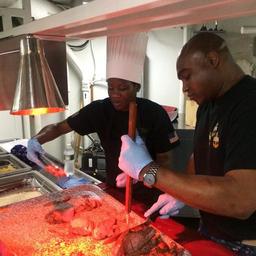 | Keywords: chief's mess chiefsmess brunch ike cvn 69 cvn69 160626-N-XK202-008 MEDITERRANEAN SEA (June 26, 2016) - Senior Chief Hospital Corpsman William Strickland and Chief Operations Specialist Aaliyah Williams carve meat for Sailors during Sunday brunch in the aft mess decks of the aircraft carrier USS Dwight D. Eisenhower (CVN 69) (Ike). Ike, the flagship of the Eisenhower Carrier Strike Group, is conducting naval operations in the U.S. 6th Fleet area of operations in support of U.S. national security interests in Europe. (U.S. Navy Photo by MCC John Osborne/Released) 160626-N-XK202-008 MEDITERRANEAN SEA (June 26, 2016) - Senior Chief Hospital Corpsman William Strickland and Chief Operations Specialist Aaliyah Williams carve meat for Sailors during Sunday brunch in the aft mess decks of the aircraft carrier USS Dwight D. Eisenhower (CVN 69) (Ike). Ike, the flagship of the Eisenhower Carrier Strike Group, is conducting naval operations in the U.S. 6th Fleet area of operations in support of U.S. national security interests in Europe. (U.S. Navy Photo by MCC John Osborne/Released) |