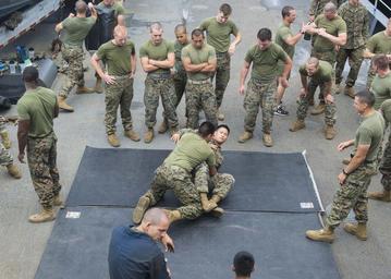| Keywords: marine corps martial arts program marinecorpsmartialartsprogram mcmap dock landing ship docklandingship uss whidbey island usswhidbeyisland lsd 41 lsd41 atlantic ocean atlanticocean people outdoor 160706-N-TI017-052 ATLANTIC OCEAN (July 6, 2016) Marines from the 22nd Marine Expeditionary Unit practice submission techniques during Marine Corps Martial Arts Program training aboard the amphibious dock landing ship USS Whidbey Island (LSD 41) July 6, 2016. Whidbey Island is deployed with the Wasp Amphibious Ready Group to support maritime security operations and theater security cooperation efforts in the U.S. 6th Fleet area of operations. (U.S. Navy photo by Mass Communication Specialist 2nd Class Nathan R. McDonald/Released) 160706-N-TI017-052 ATLANTIC OCEAN (July 6, 2016) Marines from the 22nd Marine Expeditionary Unit practice submission techniques during Marine Corps Martial Arts Program training aboard the amphibious dock landing ship USS Whidbey Island (LSD 41) July 6, 2016. Whidbey Island is deployed with the Wasp Amphibious Ready Group to support maritime security operations and theater security cooperation efforts in the U.S. 6th Fleet area of operations. (U.S. Navy photo by Mass Communication Specialist 2nd Class Nathan R. McDonald/Released) |