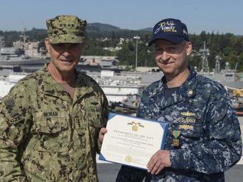 | Keywords: 160725-N-DA275-082 160725-N-DA275-082.jpg en NAVAL BASE KITSAP-BREMERTON Wash July 25 2016 Lt Cmdr Evan J LaFrance receives a Navy/Marine Corps Achievement Medal from Adm Bill Moran Vice Chief of Naval Operations on the flight deck of USS Nimitz CVN 68 for responding to an electrical shock victim on the pier LaFrance directed and administered personnel and first aid on the scene while remaining on scene to direct traffic and crowd control Nimitz is currently undergoing an extended planned incremental maintenance availability at Puget Sound Naval Shipyard and Intermediate Maintenance Facility where the ship is receiving scheduled maintenance and upgrades U S Navy photo by Mass Communication Specialist 3rd Class Samuel H Bacon/Released <br>Unit Navy Media Content Services 2016-07-25 Samuel H Bacon https //www dvidshub net/image/2767578/160725-n-da275-082 160725-N-DA275-082 2016-08-04 00 38 NAVAL BASE KITSAP - BREMERTON WASHINGTON US PD-USGov-Military-Navy Naval Base Kitsap USS Nimitz CVN-68 Images from DoD uploaded by FĂŚ |
