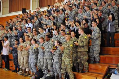 | Keywords: taekwondo u.s. army usarmy u.s. marine corps usmarinecorps u.s. navy usnavy u.s. air force usairforce presidio of monterey presidioofmonterey korea auditorium The Kukkiwon Taekwondo Demonstration Team from Korea performed a traditional martial arts demonstration at the Presidio of Monterey, California, Price Fitness Center Aug. 3. The Defense Language Institute Foreign Language Center Korean School hosted the event. Following the demonstration, the team answered questions in Korean for the benefit of the students. Kukkiwon, known as the World Taekwondo Headquarters, is the center of taekwondo culture in Korea with teams touring about 120 countries as ambassadors of the traditional martial art for the past 40 years. (U.S. Army photo by Patrick Bray/Released) The Kukkiwon Taekwondo Demonstration Team from Korea performed a traditional martial arts demonstration at the Presidio of Monterey, California, Price Fitness Center Aug. 3. The Defense Language Institute Foreign Language Center Korean School hosted the event. Following the demonstration, the team answered questions in Korean for the benefit of the students. Kukkiwon, known as the World Taekwondo Headquarters, is the center of taekwondo culture in Korea with teams touring about 120 countries as ambassadors of the traditional martial art for the past 40 years. (U.S. Army photo by Patrick Bray/Released) |