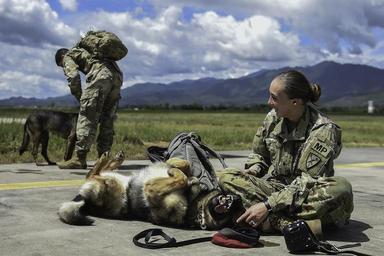 | Keywords: mwd k9 jsf security forces securityforces dog black hawk blackhawk helicopter 1-228th avn 1228thavn hoist medevac training medevactraining soto cano air base sotocanoairbase honduras hn outdoor U.S. Army Spc. Mariah Ridge, a military working dog handler assigned to Joint Task Force-Bravo’s Joint Security Forces, laughs at her MWD, Jaska, during K9 hoist evacuation training at Soto Cano Air Base, Honduras, August 15, 2016. Although the MWDs and their handlers were training in 90 degree, 100 percent humidity weather, they managed to stay in good spirits. (U.S. Air Force photo by Staff Sgt. Siuta B. Ika) www.dvidshub.net U.S. Army Spc. Mariah Ridge, a military working dog handler assigned to Joint Task Force-Bravo’s Joint Security Forces, laughs at her MWD, Jaska, during K9 hoist evacuation training at Soto Cano Air Base, Honduras, August 15, 2016. Although the MWDs and their handlers were training in 90 degree, 100 percent humidity weather, they managed to stay in good spirits. (U.S. Air Force photo by Staff Sgt. Siuta B. Ika) www.dvidshub.net |