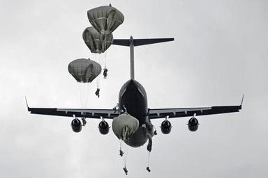 MAKE A MEME View Large Image Paratroopers assigned to the 4th Infantry Brigade Combat Team (Airborne), 25th Infantry Division, U.S. Army Alaska, jump from a C-17 Globemaster III during a joint forcible entry exercise at Malemute Drop Zone on Joint Base ...