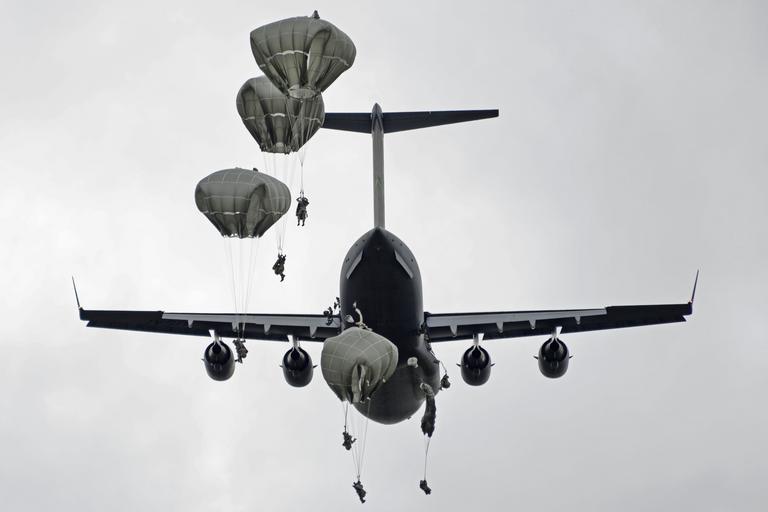 Keywords: airplane vehicle aircraft Paratroopers assigned to the 4th Infantry Brigade Combat Team (Airborne), 25th Infantry Division, U.S. Army Alaska, jump from a C-17 Globemaster III during a joint forcible entry exercise at Malemute Drop Zone on Joint Base Elmendorf-Richardson, Alaska, Aug. 23, 2016, as part of Exercise Spartan Agoge. Spartan Agoge is a brigade-level field training exercise that began Aug. 15, and focuses on an array of combat-related tasks from squad live-fire exercises to helicopter air insertion and airborne assault training. (U.S. Air Force photo by Airman 1st Class Valerie Monroy) Paratroopers assigned to the 4th Infantry Brigade Combat Team (Airborne), 25th Infantry Division, U.S. Army Alaska, jump from a C-17 Globemaster III during a joint forcible entry exercise at Malemute Drop Zone on Joint Base Elmendorf-Richardson, Alaska, Aug. 23, 2016, as part of Exercise Spartan Agoge. Spartan Agoge is a brigade-level field training exercise that began Aug. 15, and focuses on an array of combat-related tasks from squad live-fire exercises to helicopter air insertion and airborne assault training. (U.S. Air Force photo by Airman 1st Class Valerie Monroy)