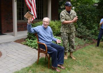 | Keywords: 160831-N-NZ935-300 160831-N-NZ935-300.jpg en 160831-N-NZ935-300 CONCORD Mass Aug 31 2016 Capt Thomas J Hudner shows off his birthday gift a plaque made of USS Constitution wood and copper from the Sailors of 'Old Ironsides' and chief petty officer selectees USS Constitution crewmembers and Chief Petty Officer Selectees surprised Medal of Honor recipient Capt Hudner at his house on his 92nd birthday U S Navy photo by Mass Communication Specialist 1st Class Joshua Hammond/Released <br>Unit Navy Media Content Services 2016-08-31 Petty Officer 1st Class Joshua Hammond https //www dvidshub net/image/2833320/160831-n-nz935-300 160831-N-NZ935-300 2016-09-03 00 01 CONCORD MA US PD-USGov-Military-Navy USS Constitution ship 1797 Images from DoD uploaded by Fæ |