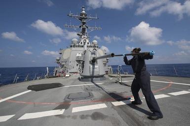 | Keywords: uss carney (ddg 64); 6th fleet; usscarneyddg646thfleet mediterranean sea mediterraneansea 160913-N-ZE250-066 MEDITERRANEAN SEA (Sept. 13, 2016) - Gunner's Mate 2nd Class Meghan Smith cleans the barrel of a MK 45 5-inch light weight gun during post fire maintenance aboard USS Carney (DDG 64) while on patrol in the Mediterranean Sea Sept. 13, 2016. Carney, an Arleigh Burke-class guided-missile destroyer, forward-deployed to Rota, Spain, is conducting a routine patrol in the U.S. 6th fleet area of operations in support of U.S. national security interests in Europe. (U.S. Navy photo by Mass Communication Specialist 3rd Class Weston Jones/Released) 160913-N-ZE250-066 MEDITERRANEAN SEA (Sept. 13, 2016) - Gunner's Mate 2nd Class Meghan Smith cleans the barrel of a MK 45 5-inch light weight gun during post fire maintenance aboard USS Carney (DDG 64) while on patrol in the Mediterranean Sea Sept. 13, 2016. Carney, an Arleigh Burke-class guided-missile destroyer, forward-deployed to Rota, Spain, is conducting a routine patrol in the U.S. 6th fleet area of operations in support of U.S. national security interests in Europe. (U.S. Navy photo by Mass Communication Specialist 3rd Class Weston Jones/Released) |