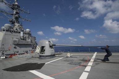 | Keywords: uss carney (ddg 64); 6th fleet; usscarneyddg646thfleet mediterranean sea mediterraneansea outdoor 160913-N-ZE250-073 MEDITERRANEAN SEA (Sept. 13, 2016) - Gunner's Mate 2nd Class Meghan Smith cleans the barrel of a MK 45 5-inch light weight gun during post fire maintenance aboard USS Carney (DDG 64) while on patrol in the Mediterranean Sea Sept. 13, 2016. Carney, an Arleigh Burke-class guided-missile destroyer, forward-deployed to Rota, Spain, is conducting a routine patrol in the U.S. 6th fleet area of operations in support of U.S. national security interests in Europe. (U.S. Navy photo by Mass Communication Specialist 3rd Class Weston Jones/Released) 160913-N-ZE250-073 MEDITERRANEAN SEA (Sept. 13, 2016) - Gunner's Mate 2nd Class Meghan Smith cleans the barrel of a MK 45 5-inch light weight gun during post fire maintenance aboard USS Carney (DDG 64) while on patrol in the Mediterranean Sea Sept. 13, 2016. Carney, an Arleigh Burke-class guided-missile destroyer, forward-deployed to Rota, Spain, is conducting a routine patrol in the U.S. 6th fleet area of operations in support of U.S. national security interests in Europe. (U.S. Navy photo by Mass Communication Specialist 3rd Class Weston Jones/Released) |
