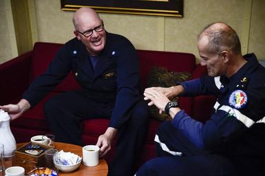 | Keywords: navy uss ross (ddg 71) ussrossddg71 ddg 71 ddg71 u.s. 6th fleet us6thfleet c6f ctf 65 ctf65 patrol mediterranean sea mediterraneansea rear adm. olivier lebas rearadmolivierlebas france indoor 160924-N-FP878-003 MEDITERRANEAN SEA (Sept. 24, 2016) Cmdr. Russell Caldwell, commanding officer of USS Ross (DDG 71), welcomes French Rear Adm. Olivier Lebas aboard USS Ross Sept. 24, 2016. Ross, an Arleigh Burke-class guided-missile destroyer, forward-deployed to Rota, Spain, is providing multi-warfare defense support to Charles de Gaulle carrier-based operations in the Eastern Mediterranean against identified ISIL positions in support of Operation Inherent Resolve. (U.S. Navy photo by Mass Communication Specialist 1st Class Theron J. Godbold/Released) 160924-N-FP878-003 MEDITERRANEAN SEA (Sept. 24, 2016) Cmdr. Russell Caldwell, commanding officer of USS Ross (DDG 71), welcomes French Rear Adm. Olivier Lebas aboard USS Ross Sept. 24, 2016. Ross, an Arleigh Burke-class guided-missile destroyer, forward-deployed to Rota, Spain, is providing multi-warfare defense support to Charles de Gaulle carrier-based operations in the Eastern Mediterranean against identified ISIL positions in support of Operation Inherent Resolve. (U.S. Navy photo by Mass Communication Specialist 1st Class Theron J. Godbold/Released) |