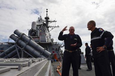 | Keywords: navy uss ross (ddg 71) ussrossddg71 ddg 71 ddg71 u.s. 6th fleet us6thfleet c6f ctf 65 ctf65 patrol mediterranean sea mediterraneansea rear adm. olivier lebas rearadmolivierlebas france outdoor 160924-N-FP878-198 MEDITERRANEAN SEA (Sept. 24, 2016) Cmdr. Russell Caldwell, left, commanding officer of USS Ross (DDG 71), gives French Rear Adm. Olivier Lebas a tour of USS Ross Sept. 24, 2016. Ross, an Arleigh Burke-class guided-missile destroyer, forward-deployed to Rota, Spain, is providing multi-warfare defense support to Charles de Gaulle carrier-based operations in the Eastern Mediterranean against identified ISIL positions in support of Operation Inherent Resolve. (U.S. Navy photo by Mass Communication Specialist 1st Class Theron J. Godbold/Released) 160924-N-FP878-198 MEDITERRANEAN SEA (Sept. 24, 2016) Cmdr. Russell Caldwell, left, commanding officer of USS Ross (DDG 71), gives French Rear Adm. Olivier Lebas a tour of USS Ross Sept. 24, 2016. Ross, an Arleigh Burke-class guided-missile destroyer, forward-deployed to Rota, Spain, is providing multi-warfare defense support to Charles de Gaulle carrier-based operations in the Eastern Mediterranean against identified ISIL positions in support of Operation Inherent Resolve. (U.S. Navy photo by Mass Communication Specialist 1st Class Theron J. Godbold/Released) |