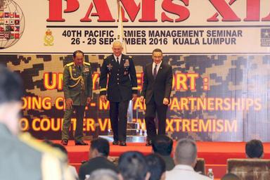 | Keywords: u.s. army pacific usarmypacific pacific armies management seminar pacificarmiesmanagementseminar #usarpac usarpac #pacom pacom pams xl pamsxl lt. gen. dato’ sri zulkiple ltgendato’srizulkiple gen. robert brown genrobertbrown kuala lumpur kualalumpur malaysia theater security theatersecurity minister of defence malaysia ministerofdefencemalaysia dato’ seri hishammuddin dato’serihishammuddin KUALA LUMPUR, Malaysia—Leaders from 30 of 34 Armies across the Indo-Asia-Pacific gathered in Kuala Lumpur, Malaysia Sept. 26 for the opening ceremony of the 40th Pacific Armies Management Seminar (PAMS XL) co-hosted by the Malaysian Army and U.S. Army Pacific. PAMS is the largest theater security and cooperation event co-hosted by USARPAC in terms of country participation and the role of co-host rotates to a different partner nation annually. The long-term objective of PAMS is to promote peace and stability in the Indo-Asia-Pacific region through mutual understanding, dialogue, and friendship Photo by Russell K. Dodson/released KUALA LUMPUR, Malaysia—Leaders from 30 of 34 Armies across the Indo-Asia-Pacific gathered in Kuala Lumpur, Malaysia Sept. 26 for the opening ceremony of the 40th Pacific Armies Management Seminar (PAMS XL) co-hosted by the Malaysian Army and U.S. Army Pacific. PAMS is the largest theater security and cooperation event co-hosted by USARPAC in terms of country participation and the role of co-host rotates to a different partner nation annually. The long-term objective of PAMS is to promote peace and stability in the Indo-Asia-Pacific region through mutual understanding, dialogue, and friendship Photo by Russell K. Dodson/released |
