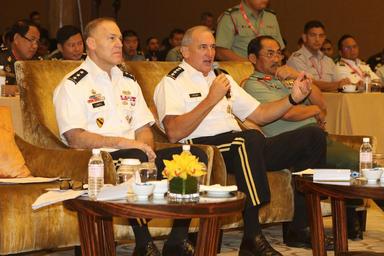 Keywords: u.s. army pacific usarmypacific pacific armies management seminar pacificarmiesmanagementseminar #usarpac usarpac #pacom pacom pams xl pamsxl lt. gen. dato’ sri zulkiple ltgendato’srizulkiple gen. robert brown genrobertbrown kuala lumpur kualalumpur malaysia theater security theatersecurity minister of defence malaysia ministerofdefencemalaysia dato’ seri hishammuddin dato’serihishammuddin indoor Delegates from the 30 attending nations engage in discussions on the overarching topic of "Unity of Effort". Topics for the plenary sessions included cover Violent Extremism: Defining the Problem from the Perspective of Regional Armies; Violent Extremism and the Information Domain: Challenges and Opportunities; and Creating Enduring Civil-Military Partnerships in Responding to Radicalization. This year’s PAMS has representatives from Australia, Bangladesh, Brunei, Cambodia, Canada, Chile, China, Fiji, France, India, Indonesia, Japan, Korea, Laos, Malaysia, Maldives, Mongolia, Nepal, New Zealand, Pakistan, Papua New Guinea, Philippines, Singapore, Sri Lanka, Thailand, Tonga, United States, United Kingdom, Vanuatu, and Vietnam. PAMS is an annual multinational military seminar providing a forum for senior-level (lieutenant colonel to major general, or national equivalent) officers from regional ground forces and security forces to exchange views. It is not only a forum to further understanding of subjects studied, but also an opportunity to establish and enhance a set of strong interpersonal relationships among the future leaders of regional armies and security forces. The Field Commander West, Malaysian Army and Commanding General, United States Army Pacific (USARPAC) serve as the co-host for PAMS XL. Photo by Russell K. Dodson/released Delegates from the 30 attending nations engage in discussions on the overarching topic of "Unity of Effort". Topics for the plenary sessions included cover Violent Extremism: Defining the Problem from the Perspective of Regional Armies; Violent Extremism and the Information Domain: Challenges and Opportunities; and Creating Enduring Civil-Military Partnerships in Responding to Radicalization. This year’s PAMS has representatives from Australia, Bangladesh, Brunei, Cambodia, Canada, Chile, China, Fiji, France, India, Indonesia, Japan, Korea, Laos, Malaysia, Maldives, Mongolia, Nepal, New Zealand, Pakistan, Papua New Guinea, Philippines, Singapore, Sri Lanka, Thailand, Tonga, United States, United Kingdom, Vanuatu, and Vietnam. PAMS is an annual multinational military seminar providing a forum for senior-level (lieutenant colonel to major general, or national equivalent) officers from regional ground forces and security forces to exchange views. It is not only a forum to further understanding of subjects studied, but also an opportunity to establish and enhance a set of strong interpersonal relationships among the future leaders of regional armies and security forces. The Field Commander West, Malaysian Army and Commanding General, United States Army Pacific (USARPAC) serve as the co-host for PAMS XL. Photo by Russell K. Dodson/released
