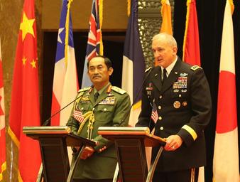 | Keywords: u.s. army pacific usarmypacific pacific armies management seminar pacificarmiesmanagementseminar #usarpac usarpac #pacom pacom pams xl pamsxl lt. gen. dato’ sri zulkiple ltgendato’srizulkiple gen. robert brown genrobertbrown kuala lumpur kualalumpur malaysia theater security theatersecurity minister of defence malaysia ministerofdefencemalaysia dato’ seri hishammuddin dato’serihishammuddin indoor Right) U.S. Army Pacific Commander Gen. Robert B. Brown gives Pacific Armies Management Seminar XL closing remarkds while Lt. Gen. Dato’ Sri Zulkiple, Field Commander West, Malaysian Army listens intently. Leaders from 30 of 34 Armies across the Indo-Asia-Pacific gathered in Kuala Lumpur, Malaysia from Sept. 26 – 29 for the 40th PAMS co-hosted by the Malaysian Army and USARPAC. PAMS is the largest theater security and cooperation event co-hosted by USARPAC in terms of country participation and the role of co-host rotates to a different partner nation annually. The long-term objective of PAMS is to promote peace and stability in the Indo-Asia-Pacific region through mutual understanding, dialogue, and friendship. (Photo by Russell K. Dodson/released) Right) U.S. Army Pacific Commander Gen. Robert B. Brown gives Pacific Armies Management Seminar XL closing remarkds while Lt. Gen. Dato’ Sri Zulkiple, Field Commander West, Malaysian Army listens intently. Leaders from 30 of 34 Armies across the Indo-Asia-Pacific gathered in Kuala Lumpur, Malaysia from Sept. 26 – 29 for the 40th PAMS co-hosted by the Malaysian Army and USARPAC. PAMS is the largest theater security and cooperation event co-hosted by USARPAC in terms of country participation and the role of co-host rotates to a different partner nation annually. The long-term objective of PAMS is to promote peace and stability in the Indo-Asia-Pacific region through mutual understanding, dialogue, and friendship. (Photo by Russell K. Dodson/released) |
