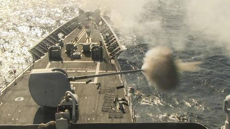 | Keywords: swatt united states of america unitedstatesofamerica outdoor USS Princeton (CG 59) fires a MK45 5-inch gun on a high speed maneuvering surface target during an exercise in the Southern California operating area Oct. 2, 2016. Thirteen warfare tactics instructors are underway with USS Nimitz Carrier Strike Group leading the Surface Warfare Advanced Tactical Training (SWATT). SWATT is a three-week exercise to tactically prepare cruisers and destroyers for carrier strike group integration. Naval Surface and Mine Warfighting Development Center opened June 9, 2015, at Naval Base San Diego and is responsible for increasing the tactical proficiency of the Navy's surface warfare community through the creation of warfare doctrine, underway advanced-training exercises and warfare tactics instructors. (U.S. Navy Combat Camera photo by Petty Officer 1st Class Trevor Andersen/Released) USS Princeton (CG 59) fires a MK45 5-inch gun on a high speed maneuvering surface target during an exercise in the Southern California operating area Oct. 2, 2016. Thirteen warfare tactics instructors are underway with USS Nimitz Carrier Strike Group leading the Surface Warfare Advanced Tactical Training (SWATT). SWATT is a three-week exercise to tactically prepare cruisers and destroyers for carrier strike group integration. Naval Surface and Mine Warfighting Development Center opened June 9, 2015, at Naval Base San Diego and is responsible for increasing the tactical proficiency of the Navy's surface warfare community through the creation of warfare doctrine, underway advanced-training exercises and warfare tactics instructors. (U.S. Navy Combat Camera photo by Petty Officer 1st Class Trevor Andersen/Released) |