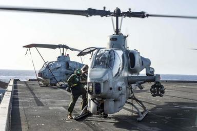 | Keywords: san antonio; lpd 17; deployment; underway; norfolk; navy; 22nd meu; marines; expeditionary unit sanantoniolpd17deploymentunderwaynorfolknavy22ndmeumarinesexpeditionaryunit aircraft vehicle outdoor rotor blade 161023-N-DQ840-093 MEDITERRANEAN SEA (Oct. 23, 2016) An AH-1 Super Cobra helicopter, from the 22nd Marine Expeditionary Unit (MEU) performs final inspections prior to takeoff aboard the amphibious transport dock ship USS San Antonio (LPD 17) Oct 23, 2016. The 22nd MEU, embarked on San Antonio, is conducting precision air strikes in support of the Libyan Government of National Accord-aligned forces against Daesh targets in Sirte, Libya as part of Operation Odyssey Lightning. (U.S. Navy photo by Petty Officer 2nd Class Adam Austin/Released) 161023-N-DQ840-093 MEDITERRANEAN SEA (Oct. 23, 2016) An AH-1 Super Cobra helicopter, from the 22nd Marine Expeditionary Unit (MEU) performs final inspections prior to takeoff aboard the amphibious transport dock ship USS San Antonio (LPD 17) Oct 23, 2016. The 22nd MEU, embarked on San Antonio, is conducting precision air strikes in support of the Libyan Government of National Accord-aligned forces against Daesh targets in Sirte, Libya as part of Operation Odyssey Lightning. (U.S. Navy photo by Petty Officer 2nd Class Adam Austin/Released) |