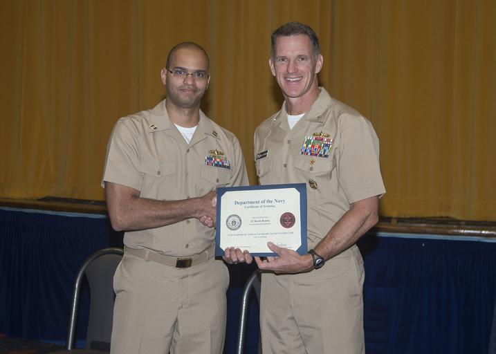 | Keywords: 161104-N-MB306-121 161104-N-MB306-121.jpg en SAN DIEGO Nov 4 2016 Lt Kevin Beasley is congratulated by Rear Adm William Byrne commander carrier strike group 11 during a graduation ceremony for Naval Surface and Mine Warfighting Development Center's SMWDC 17 new Warfare Tactics Instructors at Naval Base San Diego Beasley was the 100th surface warfare officer to graduate from SMWDC's intensive 90-day WTI course Byrne the ceremony's key note speaker said You are now teachers coaches and mentors for the fleet -- teach well coach well and lead well Akin to Navy Fighter Weapons School TOP GUN for the Navy's best aviators SMWDC is charged with increasing the tactical proficiency of the surface fleet by selecting an elite cadre of surface warfare officers to become WTIs - the best of the best in tactics WTIs come from three surface warfare communities amphibious warfare anti-submarine/anti-surface warfare or integrated air and missile defense WTI classes are held biannually - the next classes commence in January and July 2017 U S Navy photo by Petty Officer 2nd Class Zachary Bell/Released Unit Navy Media Content Services DVIDS Tags NMCS; DVIDS Bulk Import 2016-11-04 Zachary Bell https //www dvidshub net/image/2980444/161104-n-mb306-121 161104-N-MB306-121 2016-11-10 00 59 PD-USGov-Military-Navy Naval Base San Diego Images from DoD uploaded by Fæ |