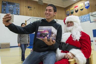 | Keywords: toys for tots toysfortots alaska u.s. marine corps reserve usmarinecorpsreserve buckland united states unitedstates us people indoor Jacob, 15, a student at Nunachiam Sissauni School, takes a selfie with U.S. Marine Corps 1st Sgt. Joshua Guffey, dressed as Santa Claus, assigned to Detachment Delta, 4th Law Enforcement Battalion, during Toys for Tots at Buckland, Alaska, Nov. 29, 2016. Toys for Tots is supported by the United States Marine Corps Reserve with a goal of delivering, through a new toy during the holiday season, a message of hope to youngsters that will assist them in becoming responsible, productive and patriotic citizens. Two teams of Marines traveled via snow machine to 10 remote villages in the vicinities of Kotzebue to deliver toys to children during the holiday season. (U.S. Air Force photo/Alejandro Pena) Jacob, 15, a student at Nunachiam Sissauni School, takes a selfie with U.S. Marine Corps 1st Sgt. Joshua Guffey, dressed as Santa Claus, assigned to Detachment Delta, 4th Law Enforcement Battalion, during Toys for Tots at Buckland, Alaska, Nov. 29, 2016. Toys for Tots is supported by the United States Marine Corps Reserve with a goal of delivering, through a new toy during the holiday season, a message of hope to youngsters that will assist them in becoming responsible, productive and patriotic citizens. Two teams of Marines traveled via snow machine to 10 remote villages in the vicinities of Kotzebue to deliver toys to children during the holiday season. (U.S. Air Force photo/Alejandro Pena) |