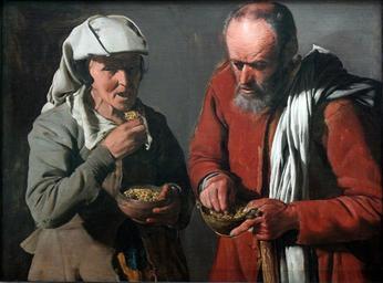 | Keywords: 1622-25 de la Tour Erbsen essendes Bauernpaar anagoria.JPG Artwork Creator Georges de La Tour title Erbsen essences Bauernpaar Peasant Couple eating Peas К естьянские па ы есть го ох ca 1620 1625 oil on canvas cm 76 2 90 8 http //www spk-digital de/showDetail html id 22/bam/museum/smb/gg/00020634 22 Stiftung Preußischer Kulturbesitz<br>http //www bpk-images de/shop bpk-images de search 00020634 Accession number 76 1 own anagoria PD-old-100 DEFAULTSORT La Tour Peasant Couple eating Peas Georges de La Tour French paintings in the Gemäldegalerie Berlin Baroque paintings in the Gemäldegalerie Berlin Baroque paintings of people Eating in paintings Paintings of bearded men Paintings of men with red clothing Paintings of standing couples Paintings with grey background People with grey background in art 17th-century food drinks and cooking in painting 17th-century oil on canvas paintings in Germany 1620s paintings in the Gemäldegalerie Berlin Files by User anagoria |