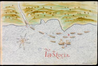 | Keywords: 1632 Cardona Descripcion Indias (29).jpg es Escena de la isla caribeña de Santa Lucía Página 29 de las Descripciones geográphicas e hydrográphicas de muchas tierras y mares del Norte y Sur en las Indias en especial del descubrimiento del Reino de la California redactadas por el capitán Nicolás de Cardona tras su expedición de 1614 s of many northern and southern lands and seas in the Indies specifically the discovery of the kingdom of California written by captain Nicolás de Cardona after his expedition of 1614 1632-06-24 Descripciones geográficas e hidrográficas de muchas tierras y mares del Norte y Sur en las Indias en especial del descubrimiento del Reino de California hecho con trabajo e industria por el capitán y cabo Nicolás de Cardona dirigidas al Exmo D Gaspar de Guzmán Conde de Olivares http //bdh bne es/bnesearch/detalle/bdh0000011007 Biblioteca Digital Hispánica Biblioteca Nacional de España Nicolás de Cardona other versions PD-Art PD-old-100 ca 1632 Spain watermark Descripciones geográphicas e hydrográphicas de muchas tierras y mares del Norte y Sur en las Indias en especial del descubrimiento del Reino de la California Maps by Nicolás de Cardona Watercolor maps Maps in Spanish Pictorial maps 1632 maps Old manuscript maps Old maps of Saint Lucia |