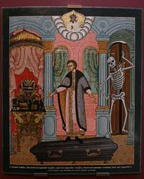 | Keywords: С. Ушаков 1660 Смертный человек.jpg ru асте С Ушаков 1660 год написания Поучительная икона-п итча В ве хней части композиции в облаках Господь Бог; ниже на че ном г обе стоит молодой человек в богатой одежде к кото ому об ащены слова п итчи «Сме тный человек бойся Того кто над тобою е надейся на то что пе ед тобою е уйдешь от того кто за тобою е минешь того что под тобою» Пе ед ним на оскошном столике асположены ат ибуты богатства и власти злато а за его спиной скелет с косой сме ть П итча имеет явно назидательный ха акте ге оем выведен безусый молодой человек взгляд кото ого об ащен к мате иальным благам Что выбе ет юноша по какой стезе пойдет Источник Та асов О Ю Икона и благочестие Оче ки иконного дела в импе ато ской России П ог есс Т адиция 1995 Табл 3 Об аз демонст и овался в амках выставки «П авославная икона России Ук аины и Бела уси» Т етьяковская гале ея осква - 4 июня 13 июля 2008 ациональный художественный музей Бела уси - 30 сентяб я 9 нояб я 2008 1660 http //www museum ru/N34134 http //www patriarchia ru/db/text/413529 html Creator Simon Ushakov other versions Institution Tretyakov Gallery PD-old-100 Uploaded with UploadWizard Exhibition Orthodox Icon of Russia Ukraine and Belarus 17th-century icons in the Tretyakov Gallery Pavel Tretyakov 1660 paintings in Russia Icons by Simon Ushakov in the Tretyakov gallery |