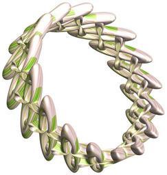 | Keywords: mathematica 3d cg parametricplot3d texture torus 輪環 りんかん ドーナツ どーなつ 四芒星 しぼうせい しこうせい 四光星 四稜星 しりょうせい program プログラム code コード algorithm コード アルゴリズム geometric sculpture geometricsculpture shape geometry sculpture mapping テクスチャ マッピング 模様 もよう design pattern デザイン パターン graphic グラフィック グラフィクス structure 意匠 構造 symmetry 対称性 たいしょうせい シンメトリー 対称 たいしょう algorithm white background SetOptions[ParametricPlot3D, PlotRange -> Full, Mesh -> None, Boxed -> False, Axes -> None, PlotPoints -> 300, ImageSize -> 2800, PlotStyle -> Directive[Specularity[White, 30], Texture[Import["D:/tmp/862.jpg"]]], TextureCoordinateFunction -> ({#4 + 2 #5, #5/Pi} &), Lighting -> "Neutral"]; a = 2; (* center hole size of a torus *) b = 4; (* tetra-torus *) c = 12; (* distance from the center of rotation *) d = 16; (* number of torus *) g[v_] := Sum[Cos[(2 k - 1) v]/(2 k - 1), {k, 3}]; x = (a - Cos[t] - Sin[b s]) g[s + Pi/(2 b)] + c; y = Sin[t] + c; z = (a - Cos[t] - Sin[b s]) Sin[s + Pi/(2 b)] + c; rot = Table[{x, y, z}.RotationMatrix[2 i Pi/d, {1, 0, 1}], {i, d}]; ParametricPlot3D[rot, {t, 0, 2 Pi}, {s, 0, 2 Pi}] (*--- The Texture The g[] is a 3-partial sum of the Fourier series for Square wave. g[]は矩形波のフーリエ展開の最初の3項 *) SetOptions[ParametricPlot3D, PlotRange -> Full, Mesh -> None, Boxed -> False, Axes -> None, PlotPoints -> 300, ImageSize -> 2800, PlotStyle -> Directive[Specularity[White, 30], Texture[Import["D:/tmp/862.jpg"]]], TextureCoordinateFunction -> ({#4 + 2 #5, #5/Pi} &), Lighting -> "Neutral"]; a = 2; (* center hole size of a torus *) b = 4; (* tetra-torus *) c = 12; (* distance from the center of rotation *) d = 16; (* number of torus *) g[v_] := Sum[Cos[(2 k - 1) v]/(2 k - 1), {k, 3}]; x = (a - Cos[t] - Sin[b s]) g[s + Pi/(2 b)] + c; y = Sin[t] + c; z = (a - Cos[t] - Sin[b s]) Sin[s + Pi/(2 b)] + c; rot = Table[{x, y, z}.RotationMatrix[2 i Pi/d, {1, 0, 1}], {i, d}]; ParametricPlot3D[rot, {t, 0, 2 Pi}, {s, 0, 2 Pi}] (*--- The Texture The g[] is a 3-partial sum of the Fourier series for Square wave. g[]は矩形波のフーリエ展開の最初の3項 *) |
