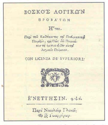 | Keywords: Βοσκός Λογικών προβάτων (1708).jpg en Cover of book Methodious Anthracite 1708 Shepherd Logical sheep el Εξώφυλλο του βιβλίου του εθοδίου Ανθρακίτη Βοσκός_Λογικών ροβάτων 1708 Εγκυκλο αίδεια ΔΟ Η Dgolitsis scan 1708 Cc-zero Title pages in Greek Title pages of Italy 1708 books Mathematics books book covers single pages etc Logic Enlightenment philosophy |