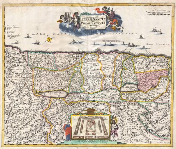 | Keywords: 1720 Funck Map of Israel - Palestine - Holy Land - Geographicus - TerraeSanctae-funck-1720.jpg An altogether stunning map of the Israel Palestine or the Holy Land Issued in 1720 by David Funck of Nuremburg and geographically based upon Visscher ™s Map of 1659 and De Wit ™s Map of 1670 The shoreline runs from Sidon to Egypt along an East “ West orientation Divided according to the Tribes of Israel on both side of the River Jordan Bottom center features a plan of the Temple of Solomon with the Ark of the Covenant featuring prominently Moses and Jesus stand to either side of the plan Title cartouche appears at the top of the map and features four cherubs one of which holds the Tablets of Moses or the Ten Commandments In the Dead Sea Mare Mortuum the destroyed cities of Sodom Gamora Sebim and Adama are depicted At sea 14 ships sail the Mediterranean All text is in Latin 1720 Size in 22 18 5 object history credit line accession number TerraeSanctae-funck-1720 Geographicus-source PD-Art-100 1720 maps Maps of Ottoman Levant 1720 Maps of the Ottoman Empire in the 18th-century 1720 Old maps of Israel Old maps of Jordan Old maps of Palestine 1720 Old maps of the Holy Land Ottoman Palestine in the 18th century 1720 Ships on maps Maps in Latin Biblical maps Maps of the Tribes of Israel Sodom geography 1720 |