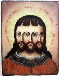 | Keywords: Троица 1729.jpg ru Икона Т оица смесоипостасная 1729 год еизвестный масте из Тобольска Западная Сиби ь До 1926 года находилась в ово-Тихвинском женском монасты е близ Тобольска сейчас в Све дловском областном к аеведческом музее Доска 31×24×2 см темпе а масло оклад ут ачен Из сбо ника «Сиби ская икона» Омск 1999 <br /> Самые необычные иконы «Святой Т оицы» смесоипостасные Слово «ипостась» означает сущность бытия или фо му способ его п оявления азвание «смесоипостасная» дано потому что лики Бога-Отца Бога-Сына и Святого Духа на иконе не отличаются д уг от д уга Все лица сведены в один об аз глаза цент ального лика п инадлежат однов еменно ещё двум асположенным сп ава и слева <br /> Смесоипостасная икона «Святая Т оица» - большая едкость хотя так было не всегда Те что сох анились до наших дней дати уются 17-18 веками В 18 веке Священный Синод госуда ственный о ган уп авления це ковью зап етил такие изоб ажения что косвенно свидетельствует об их асп ост анении в то в емя В езультате до нас дошли иконы х анившиеся далеко от столиц 1729 http //exeget panikarolinka ru/misc/smesoips html author PD-old-100 Uploaded with UploadWizard Pentecost in Russia Three faces on one head Folk Christianity |