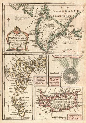 | Keywords: 1747 Bowen Map of the North Atlantic Islands, Greenland, Iceland, Faroe Islands (Maelstrom) - Geographicus - OldGreenland-bowen-1747.jpg A singularly fascinating 1747 map of Greenland Iceland and the Faroe Islands by E Bowen Essentially four maps on one sheet this map of the North Atlantic islands is festooned with speculation and curiosities The uppermost map is based on reports by the priest Hans Egede and shows the southern portions of Greenland as well as parts of Iceland and James Island When this map was drawn the coasts of Greenland were fairly well mapped out by Icelandic and Scandinavian whalers but the interior was largely unknown There was some speculation in the early 17th and 18th centuries that a water passage existed through Greenland providing easy access to Iceland from the Davis Straights Our map notes the passage but also comments that it is now impassable due to ice Bowen also notes that the seas on either side of the Island are treacherous due to mountains of Ice The lower left map depicts the Faroe Islands Today these stunning green islands are considered one of the most beautiful and unspoiled places on earth Our map depicts the Faroe Islands according a map contained in a 17th century book on the islands written by Jacobson Debes The Faroe Islands have been historically treacherous for mariners due to the unpredictable currents and tides surrounding them One of the most curious and legendary results of these currents is the great maelstrom that once roared at the southern tip of Sunderoe today Suouroy Island - depicted on our map at the right center This mighty whirlpool swirled around a sheer pinnacle of rock called Monek which was said to resemble a monk from one side and a sailing ship from the other Reports say that the whirlpool was over a mile in diameter Soundings show that the waters surrounding the whirlpool had a depth of some 80 to 90 fathoms but that the waters nearer the rock at the center of the maelstrom were but 7 to 10 fathoms deep Sadly this startling natural phenomenon is no more In 1884 much of Monek Rock crumbled into the sea creating a dangerous underwater reef and displacing the unique convergence that created the maelstrom In the lower right hand corner of our chart is a map of Iceland Iceland had been fairly well mapped since the late 16th century This map updated from earlier maps shows the royal residence and four primary provinces Drawn my Emmanuel Bowen for issue in his 1747 edition of A Complete System of Geography 1747 undated Size in 9 13 object history credit line accession number of all the countries islands cities chief towns harbours lakes and rivers mountains mines c of the known world ¦</i> 1747 edition Geographicus-source PD-old-100 Old maps of the Arctic Old maps of Greenland Maps by Emanuel Bowen 1747 maps Old maps of Iceland Old maps of Denmark Old maps of Faroe Islands Maps in English Whirlpools Maps of Iceland made in the 18th century |