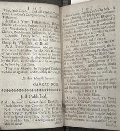 | Keywords: 1755 GarratNoel NY BostonPublicLibrary p22.jpg From A catalogue of books in history divinity law arts and sciences and the several parts of polite literature to be sold by Garrat Noel bookseller in Dock-Street New York New-York Printed by H Gaine in Queen-Street between the Fly and Meal-Markets 1755 24 p ; 16 cm Courtesy of the Trustees of the Boston Public Library/Rare Books 1755 Printed by H Gaine PD-old-100 Garrat Noel | ||||