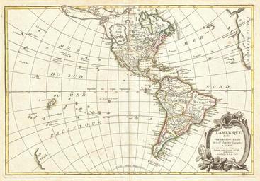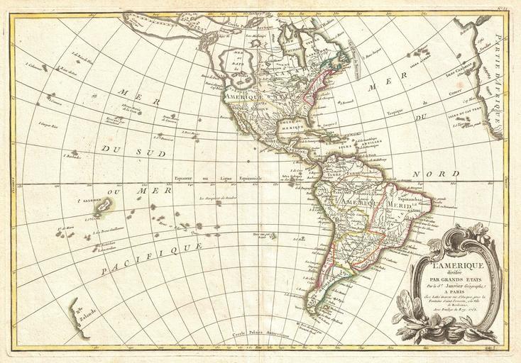 | Keywords: 1762 Janvier Map of North America and South America (Sea of the West) - Geographicus - America-latter-1762.jpg An altogether fascinating map of North America and South America by Jean Janvier dating to 1862 Covers both continents from the Antarctic Circle to the arctic circle extends westward to New Zealand and eastward as far as Africa and Spain This map which is heavily influenced by the theoretical mappings of Guillaume de l'Isle and Philippe Buache went through several states of which this is the earliest and possibly the most interesting By far the most interesting aspects of this map deal with Janvier's treatment of the largely unexplored Pacific Northwest A magnificent sea called the Sea of the West or in this case the Baye de L'Ouest occupies the greater part of the northwestern part of the continent This body of water alternatively called the Sea of the West or Mer de l'Ouest was speculated by Philippe Buache and Guillaume De l'Isle in the early 18th century based upon wishful thinking American Indian stories and the somewhat questionable 16th century explorations of Juan de Fuca Janvier gives the Mer de l'Ouest its fullest expression though he stops just short of connecting it to either the network of lakes and rivers extending westward form the Hudson Bay or to the similar network extending westward from Lake Superior These river and lake networks were being actively explored through the early 18th century by a number of little known but important French explorers Most specifically the explorations of Verenrye with regard to the discovery of the Lake of the Woods L Des Bois and Lake Winnipeg L Ouinipigon both of which appear on this map Further north we can find traces of Admiral de Fonte's apocryphal discovery of a passage from the Pacific starting at the Archipel St Lazare eastward via a network of lakes and rivers to Baffin Bay The De Fonte legend first appeared in a 1706 English publication entitled Memoirs of the Curious This short-lived magazine published a previously unknown account by a supposed Spanish Admiral named Bartholomew de Fonte De Fonte is said to have sailed up the Pacific coast of North America in 1640 On this voyage he apparently discovered a series of gigantic lakes seas and rivers heading eastward from the Pacific towards Hudson Bay The De Fonte story relates how on one of these great inland lakes he met with a westward bound ship from Boston that must to have come through the Northwest Passage Today based upon inaccuracies and falsities we know the entire De Fonte article to have been a fabrication however it set 18th century afire with speculation that a Northwest Passage must indeed exist Even such luminaries as Benjamin Franklin wrote long defenses of De Fonte Our map offers an uncommon variant on the De Fonte passage positioning its western entrada well to the north in order to accommodate the Sea of the West and situating its outlet at the Baffin rather than the Hudson Bay Even farther to the north we find a striking and exaggerated Alaska-like projection heading in the direction of Asia This bears some resemblance to the Muller Peninsula postulated around this time based on sightings of the Aleutian archipelago and their misinterpretation as a single land mass Even more so given its directional orientation it bears a significant resemblance to Gamaland or Companie Land as imagined by Sanson c 1705 A not at the very edge of this land mass claims that it was seen in 1741 suggesting either Vitus Bering or Alexei Chirikov Both did in fact search for Gama or Companie land in this year without significant success On the opposite side of the map Janvier places the Great Lakes firmly within French territory a clear case of carto-advocacy He also extends Spanish control of the eastern coast of North America well north of the traditional Florida boundary to including Georgia and parts of Carolina 1762 dated Size in 18 12 5 object history credit line accession number America-latter-1762 Lattre Jean <i>Atlas Moderne ou Collection de Cartes sur Toutes les Parties du Globe Terrestre</i> c 1775 Geographicus-source PD-old-100 Old maps of the Americas 1762 maps Maps by Jean Janvier Images from Geographicus French language maps of North America French language maps of South America |
