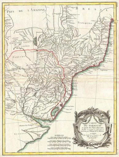 | Keywords: 1771 Bonne Map of Paraguay, Uruguay, and Brazil - Geographicus - Paraguay-bonne-1771.jpg A beautiful example of Rigobert Bonne's decorative map of Paraguay Covers from the Rio de la Plata north well into Brazil and the Amazon extends westward as far as Cordova and eastward to San Salvador Brazil Includes the modern day nations of Uruguay Paraguay and parts of adjacent Brazil and Argentina Offers excellent detail throughout showing mountains rivers national boundaries cities regions and tribes Identifies Buenos Aires Rio de Janiero and numerous other important South American cities Perhaps it most interesting element this map offers a classic representation of the apocryphal Lake of Xarayes at the northern terminus of the Paraguay River Xarayes is a corruption of Xaraiés meaning Masters of the River The Xaraiés were an indigenous people occupying what are today parts of Brazil's Matte Grosso and the Pantanal When Spanish and Portuguese explorers first navigated up the Paraguay River as always in search of El Dorado they encountered the vast Pantanal flood plain at the height of its annual inundation Understandably misinterpreting the flood plain as a gigantic inland sea they named it after the local inhabitants the Xaraies The Laguna de los Xarayes almost immediately began to appear on early maps of the region and at the same time almost immediately took on a legendary aspect as the gateway to El Dorado A large decorative title cartouche appears in the lower right quadrant Drawn by R Bonne in 1771 for issue as plate no 1771 dated Size in 13 17 object history credit line accession number Paraguay-bonne-1771 Lattre Jean <i>Atlas Moderne ou Collection de Cartes sur Toutes les Parties du Globe Terrestre</i> c 1775 Geographicus-source PD-old-100 |