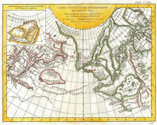 | Keywords: 1772 Vaugondy and Diderot Map of the Pacific Northwest and the Northwest Passage - Geographicus - DeFonteAutres-vaugondy-1772.jpg One of the most splendid combinations of hard fact and speculative fantasy to appear in the history of cartography This map prepared by Joseph-Nicholas de Delisle 1762 and republished by Vaugondy in 1772 covers parts of Siberia and northeastern Asia as well as the northwestern parts of the American continent including the Hudson Bay and the legendary Northwest Passage Traces the routes of several important explorers most notably Tchirikow Frondat Bering and De Fonte The origins of the wonderful map can be traced to a 1706 English publication entitled Memoirs of the Curious This short-lived magazine published a previously unpublished account by a Spanish Admiral named Bartholomew de Fonte De Fonte is said to have sailed up the Pacific coast of North America in 1640 On this voyage he apparently discovered a series of gigantic lakes seas and rivers heading eastward from the Pacific towards Hudson Bay The De Fonte story relates how on one of these great inland lakes he met with a westward bound ship from Boston that must to have come through the Northwest Passage Today based upon inaccuracies and falsities we know the entire De Fonte article to have been a fabrication however it set 18th century afire with speculation that a Northwest Passage must indeed exist When Joseph-Nicolas Delisle younger brother of the better known Guillaume Delisle returned from his tenure at Russian Tzar Peter the Great ™s Academy of Sciences he decided to publish a compilation of secret cartographic data obtained from previously unknown Russian expeditions to Kamtschaka and the coast of Siberia These seminal explorations included the discoveries of Tchirikow Frondat Bering among others He produced a ground breaking and largely accurate mapping of the peninsula of Kamchatka and the coast of northeast Asia However across the Pacific the contrast with reality could not be more extreme De Delisle based the fantastical North American portion of this map entirely on the supposed journeys of De Fonte This map traces the course of De Fonte from Cape Medocino northward past the mouth of the mythical Mer De L ™Ouest discovered by Juan de Fuca in 1692 around an unknown archipelago to access a series of lakes and rivers heading eastward to communicate with the Hudson Bay It was on one of these great lakes possibly the Lac Belle or the large Lac de Fonte where De Fonte claims to have encountered a westward bound vessel heading from Boston Heading north form this same archipelago De Delisle also describes De Fonte ™s Lac Valasco and Lake Bernarda which run eastward towards Baffin Bay only to be blocked at their extreme eastern terminus Dominating the northern part of the map is a great Arctic continent which blocks any further potential for a northwest passage to the north The upper left quadrant of this map features an alternative take on De Fonte ™s Strait of Anian Anian was first mentioned in the journals of Marco Polo and was first noted on maps by Bolognini Zaltieri in 1561 Later the term was popularized in a John Donne poem Anyan if I go west by the North-West passage In the 18th century it was interpreted as the Bering Strait by cartographers successfully transitioning it from the realms of fiction to cartography Anian presupposed the existence of a Northwest Passage and as such was entirely mythical though the lands that are now Alaska long bore that name This entire map is in sharp contrast to Jefferys ™ map of the same region In an alternative to the De Delisle map Jefferys imagined a slightly more accurate picture of the extreme northeast with a series of large rivers running eastward towards Hudson Bay These two disparate cartographic interpretations of the De Fonte story inspired considerable debate among European intellectual circles until the matter was finally put to rest by the expeditions of James Cook 1772 undated Size in 15 11 5 object history credit line accession number DeFonteAutres-vaugondy-1772 Supplement to Diderot's <i>Encyclopédie ou dictionnaire raisonné des sciences des arts et des métiers </i> or Vaugondy's <i>Recueil de 10 Cartes Traitant Particulierement de L'Amerique du Nord</i> 1779 Geographicus-source PD-old-auto-1923 1786 Robert de Vaugondy Old maps of North America Northwest Passage 1772 maps Russian Academy of Sciences Old maps of the Arctic Old maps of phantom islands Old maps of Asia |